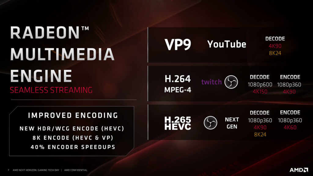 The Radeon Display Engine will pick up Display Stream Compression 1.2a support. This supports monitors up to 4K @ 240Hz as well as 4K HDR @ 120Hz and 8K HDR @ 60Hz. Notably, however, the new cards don’t support HDMI specification 2.1.