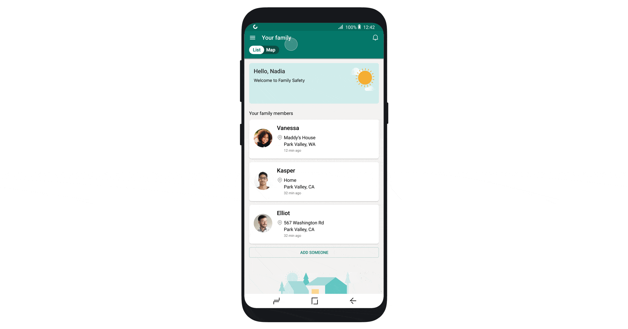 Location sharing lets you see each of your family members’ last known location on a map and save favorite locations like “home” to see, at a glance, that everyone is safe and sound.