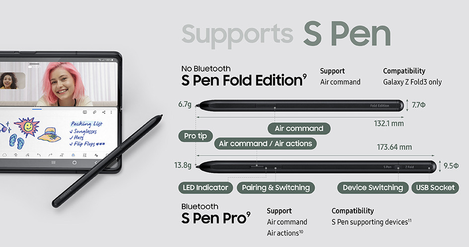The Samsung Galaxy Z Fold 3 also has S Pen support, and the S Pen for Z Fold 3 comes in two options: S Pen Fold Edition and S Pen Pro, both specially engineered retractable Pro tip with force limit technology to protect Z Fold 3’s Main Screen for peace of mind while using the S Pen.